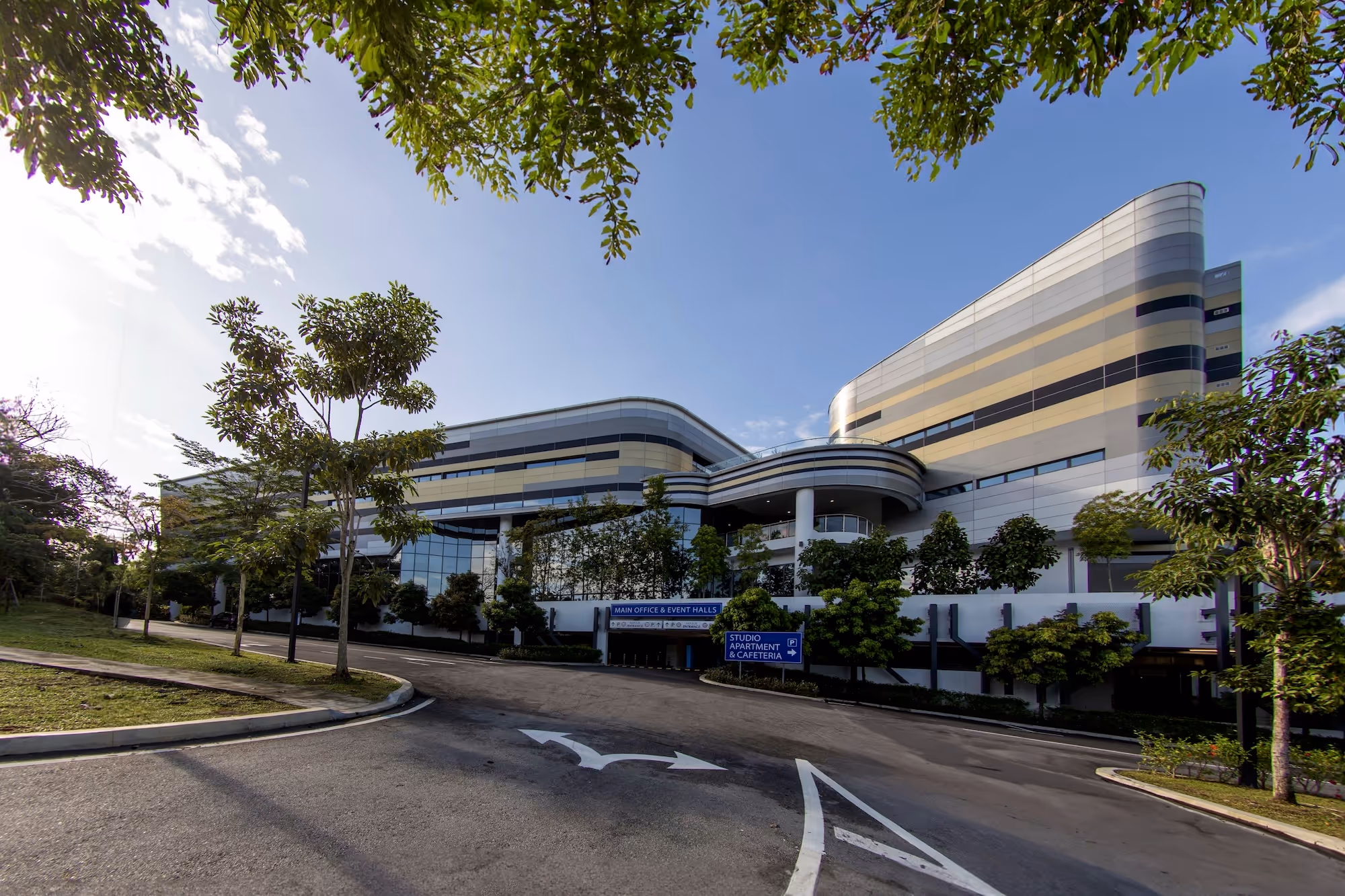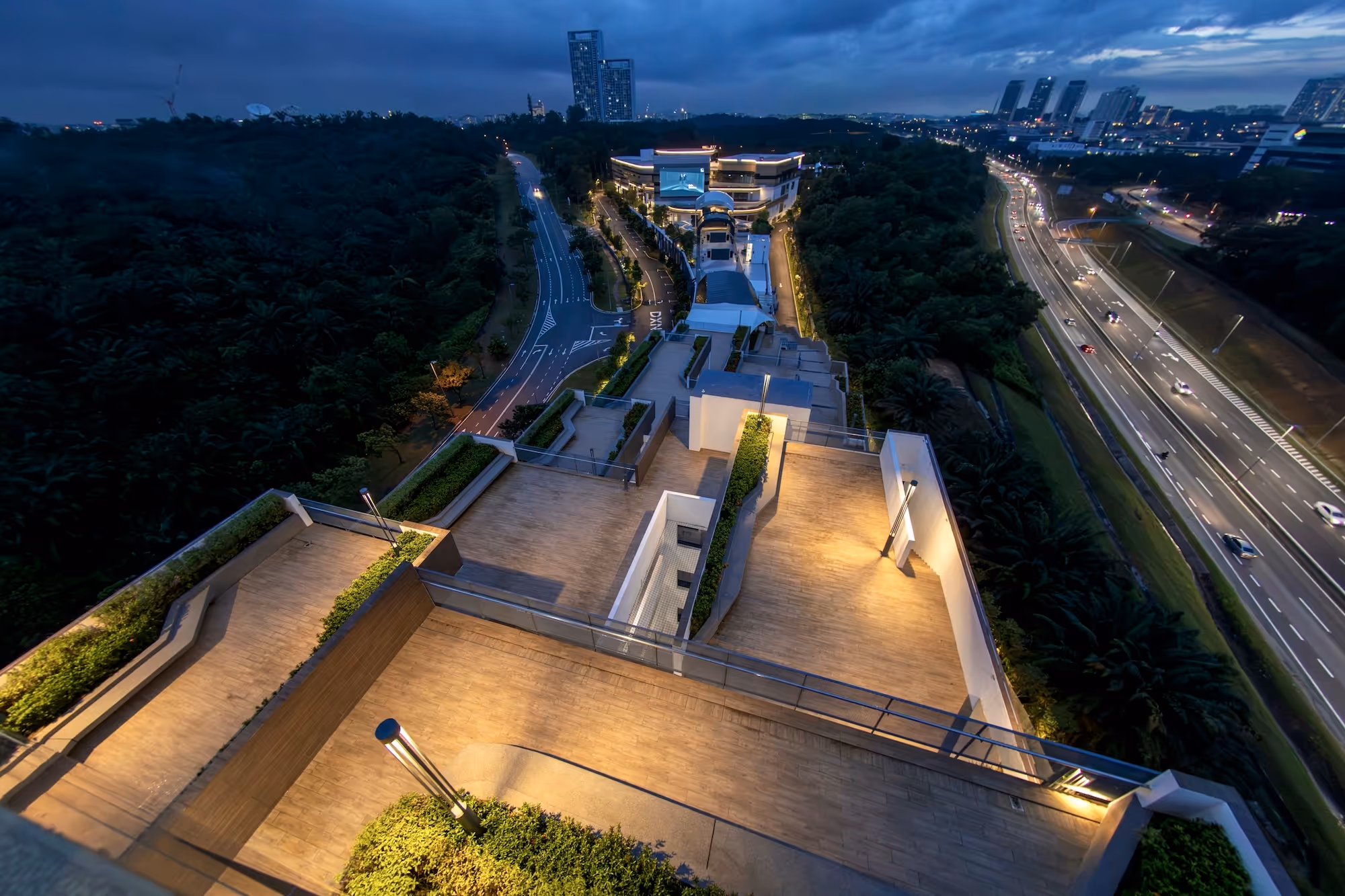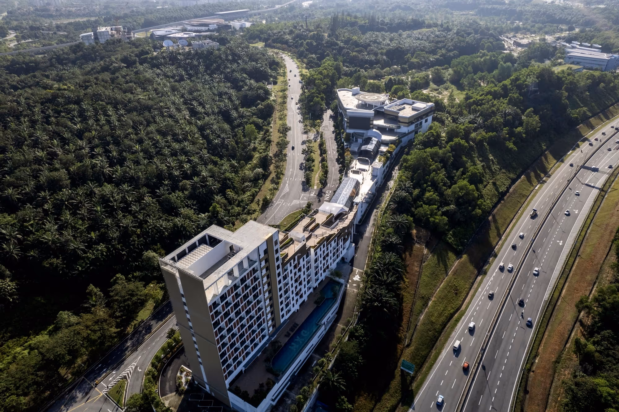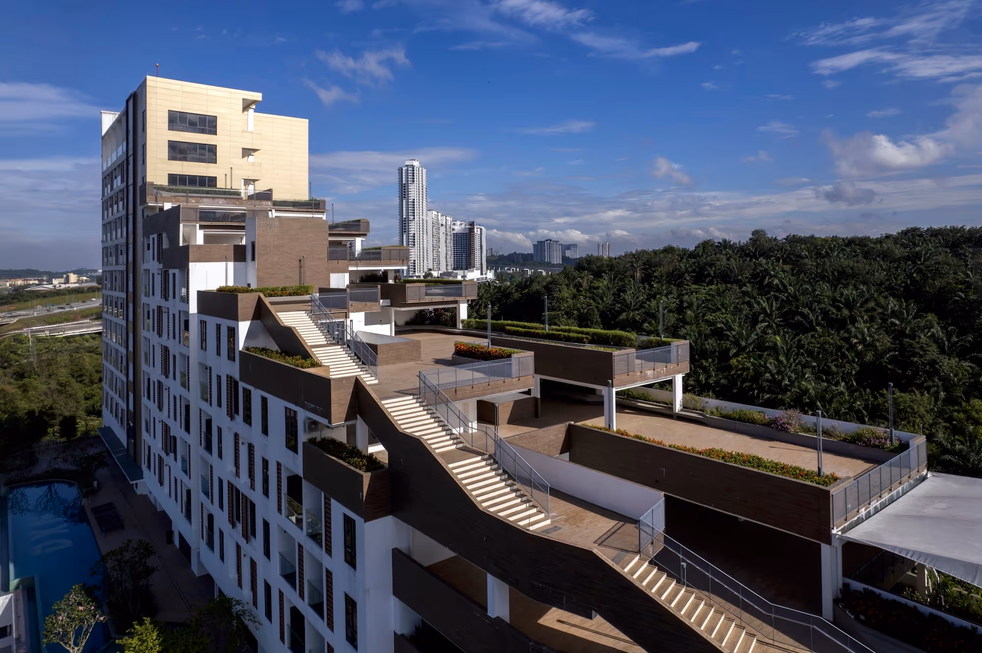 The landscaped terrace and connecting bridge define the unique character of this mixed-use commercial building, presenting a fresh approach to commercial architecture in Cyberjaya. This wellness and training centre offer exclusive retreat accommodations, tailored for staff and clientele, set a noteworthy standard for staff hospitality in corporate settings.